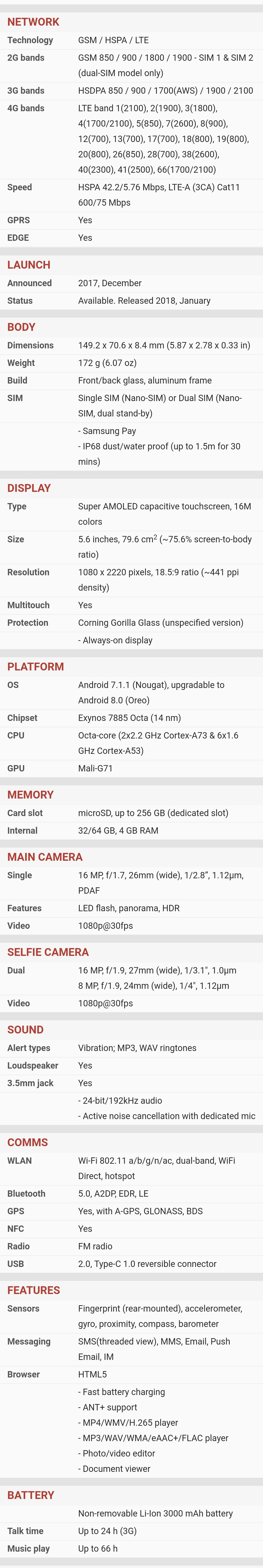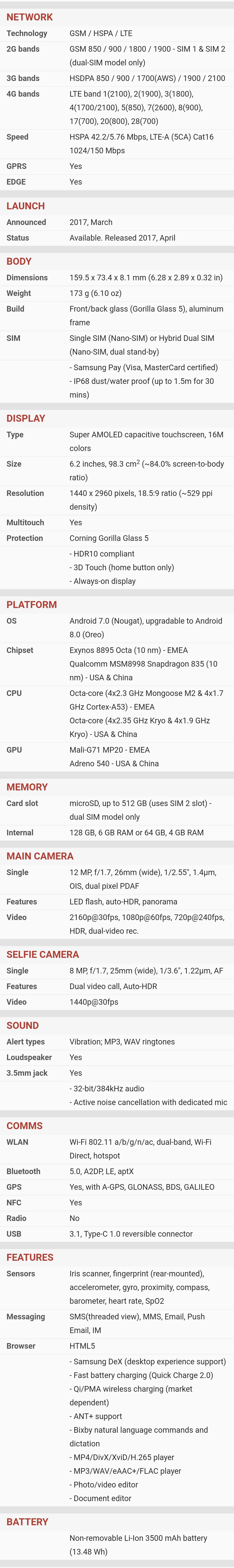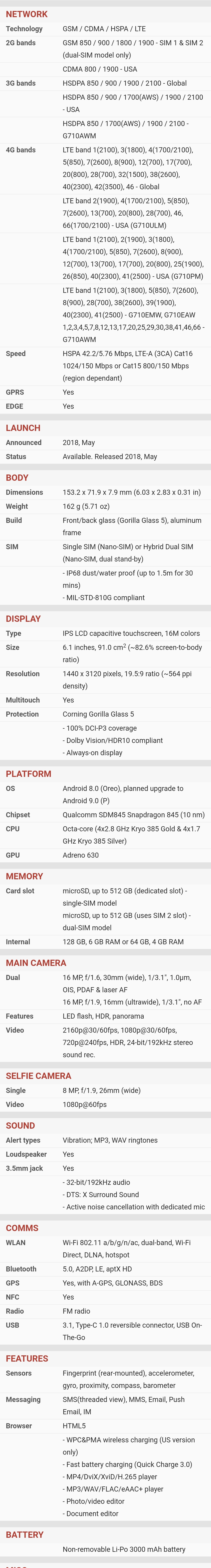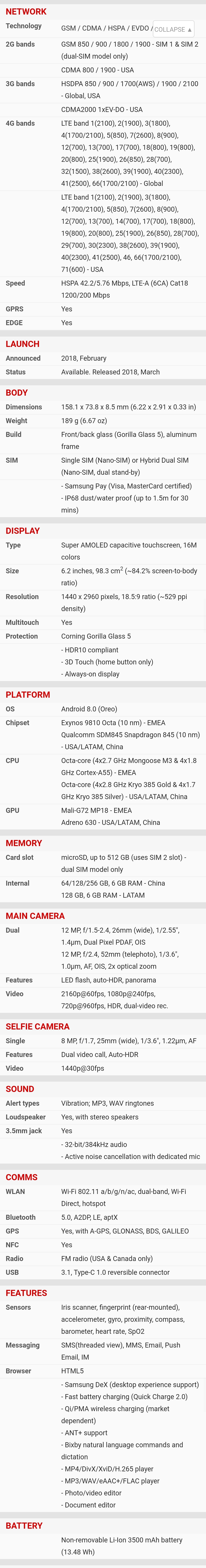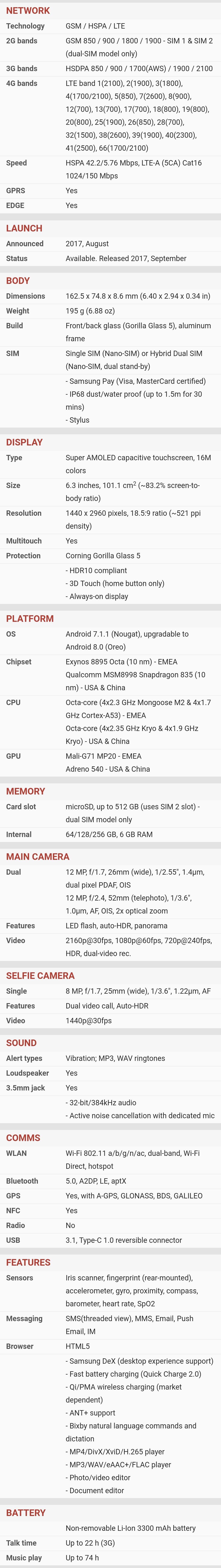 | Ekran | | | Glavni | | | | Tip : Ultra AMOLED | | | Veličina : 6.3 inča | | | Broj boja : (24-bit) 16.777.216 boja | | | Rezolucija : 1440x2960 piksela | | | Ostalo : osetljiv na dodir, | |