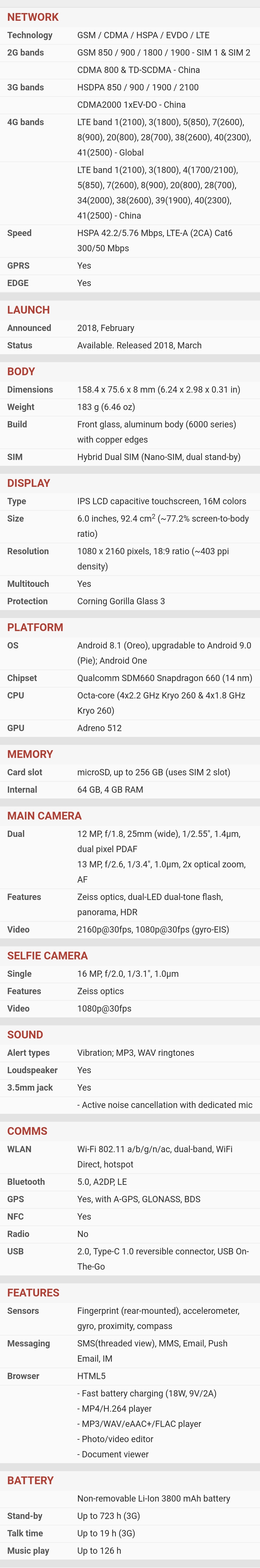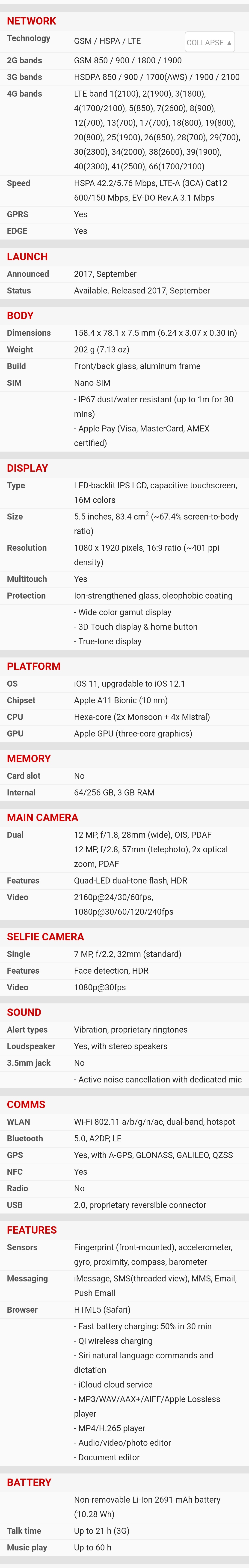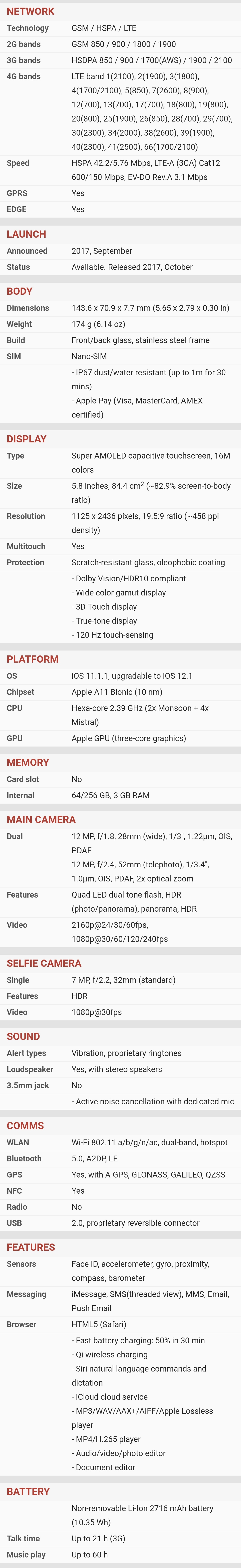 | Kamera | | | Glavna | | | | Orijentacija sočiva : sa zadnje strane | | | Broj piksela senzora : Dual 12 megapiksela | | | Rezolucija videa : (720p) 1280x720 piksela, (1080p) 1920x1080 piksela, (2160p) 3840x2160 piksela, | | | Ostalo : video zapis, optički zoom, blic, autofokus, | |